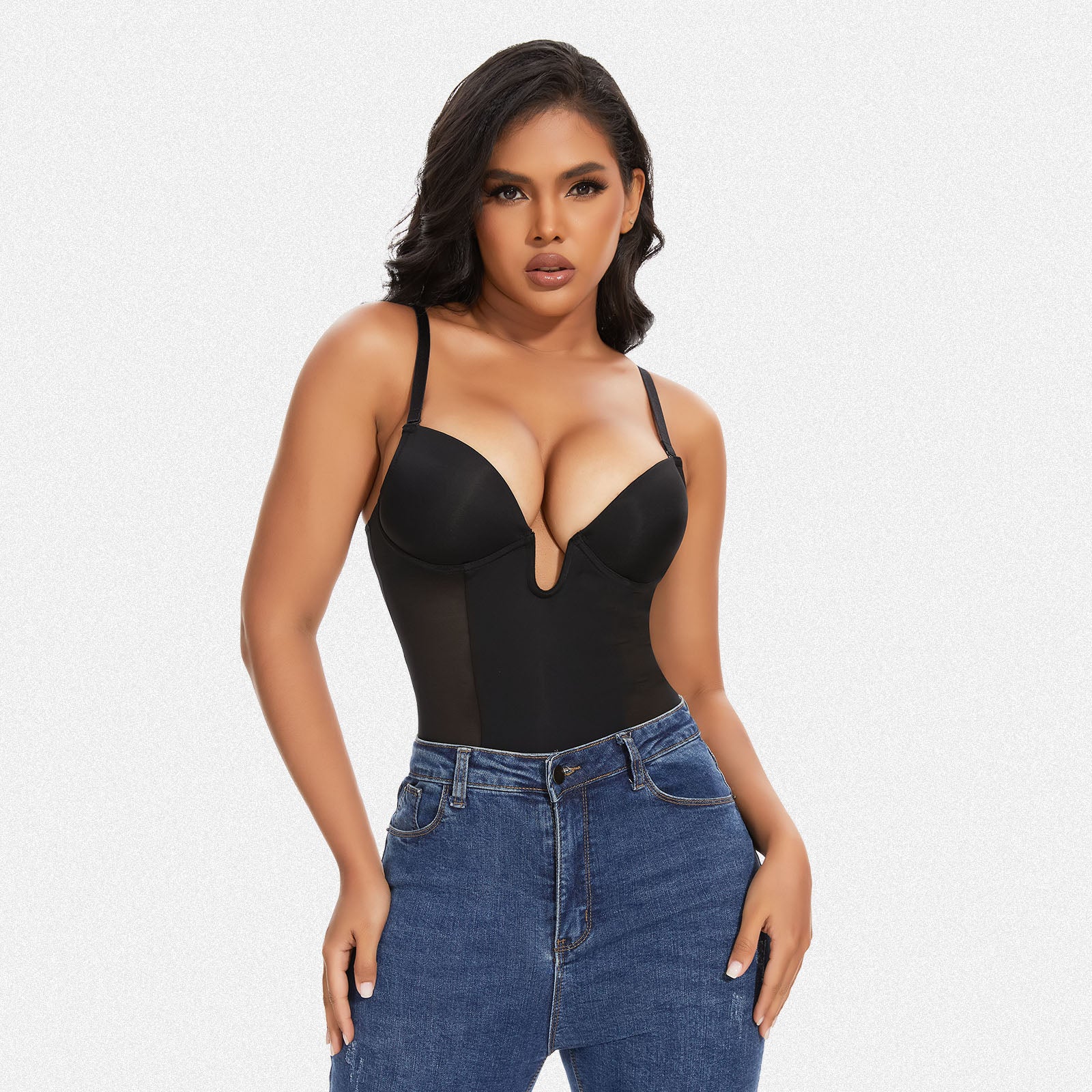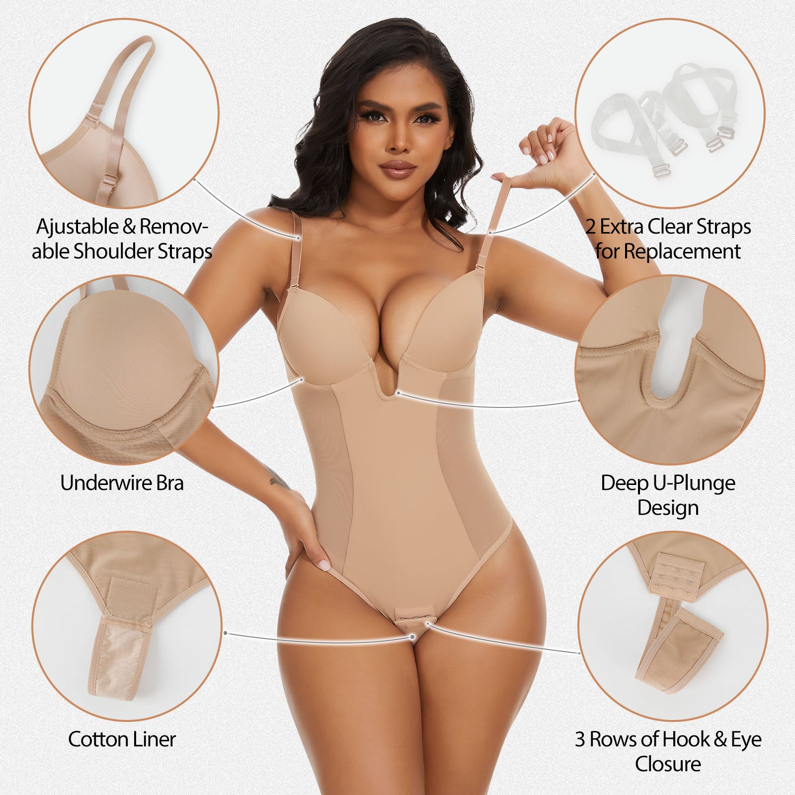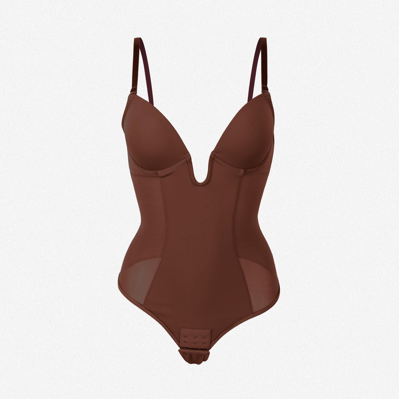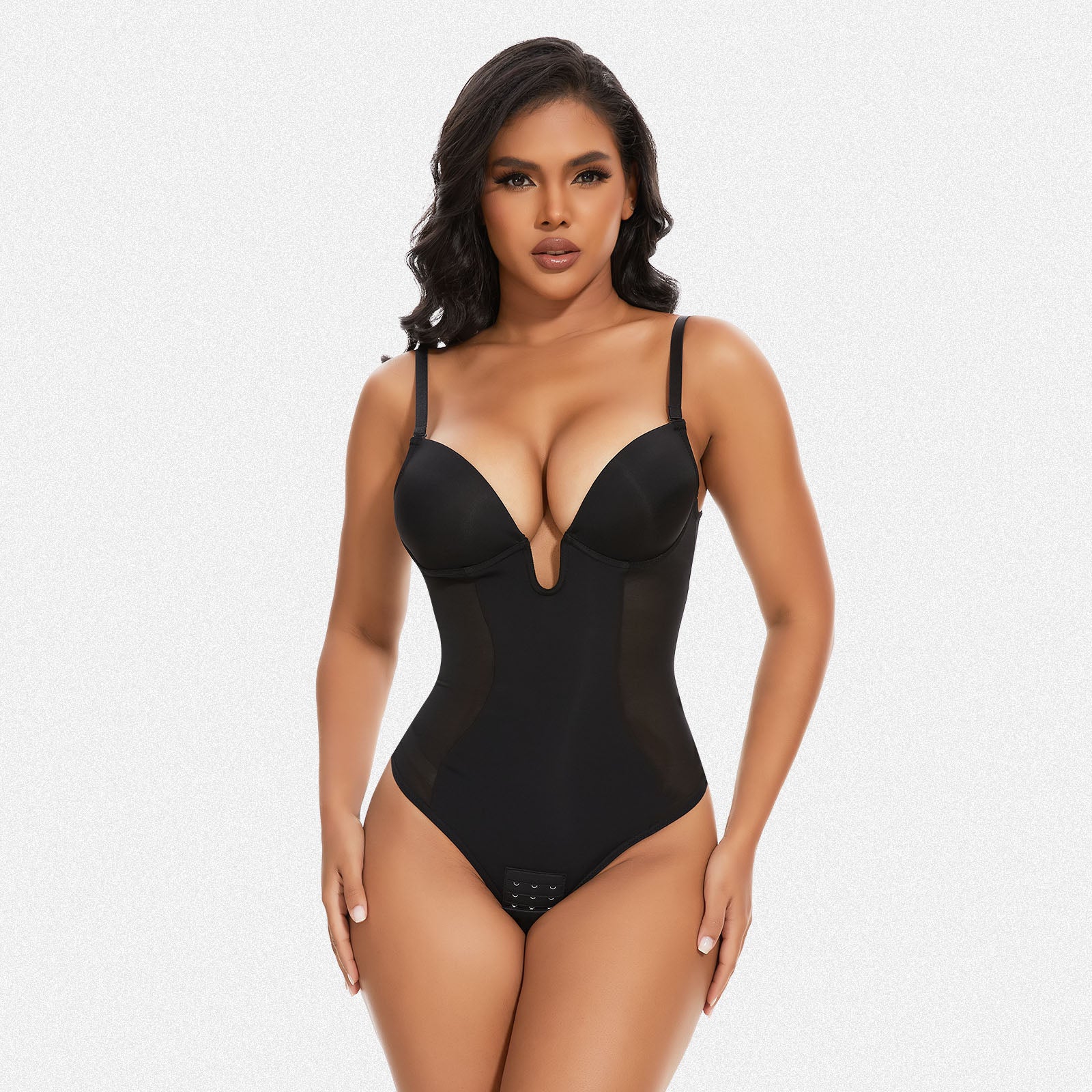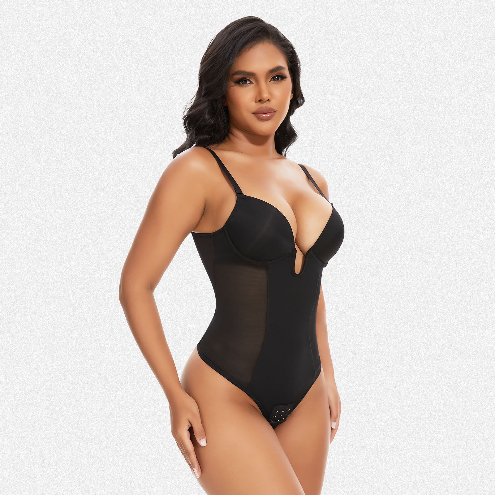 With a thong style and soft, sturdy straps, the Shaperin Backless U Plunge Thong Shapewear Bodysuit offers an effortless fit. Customize your look with detachable and adjustable straps. The underhanded chest cup steel ring and slimming compression panel provide support and shape.