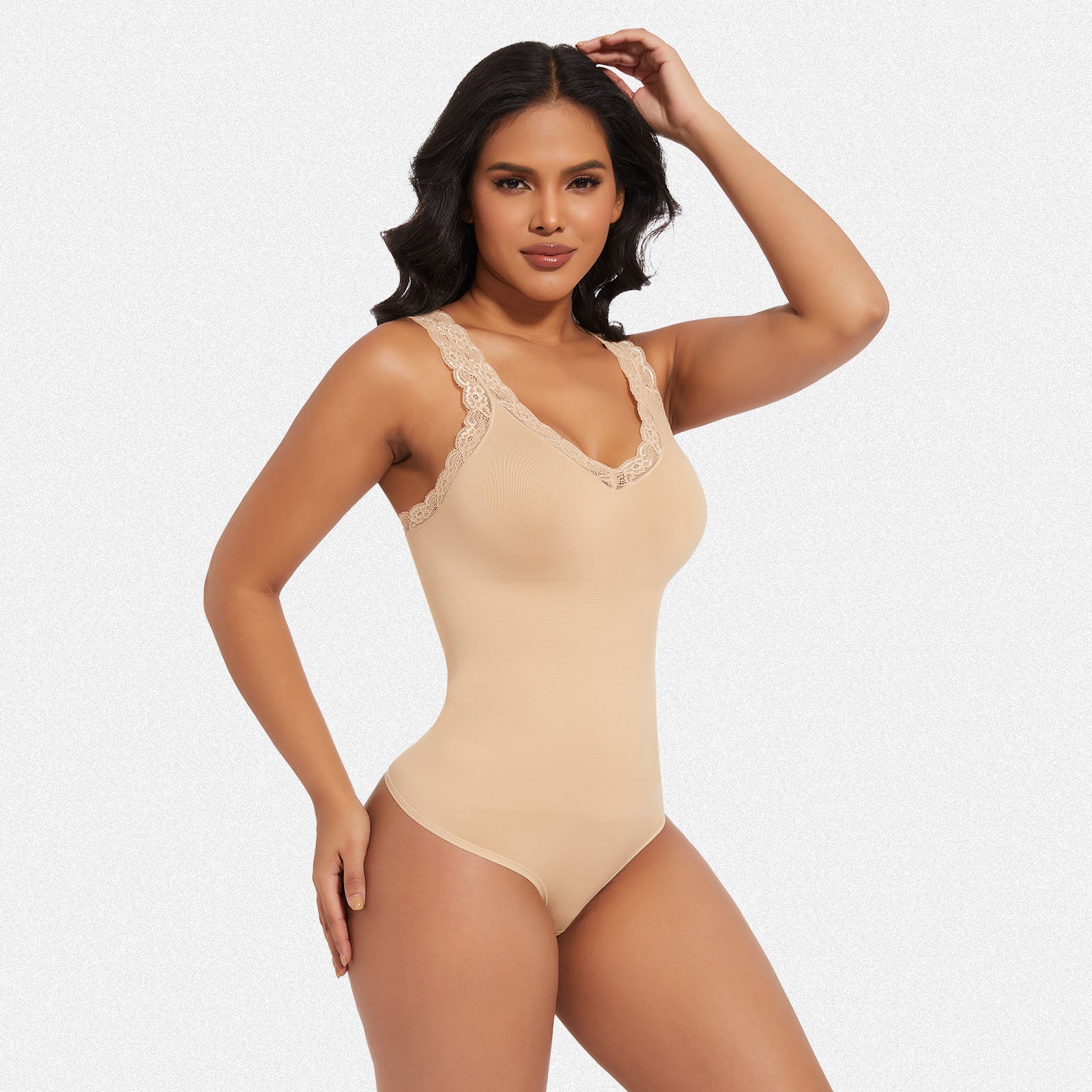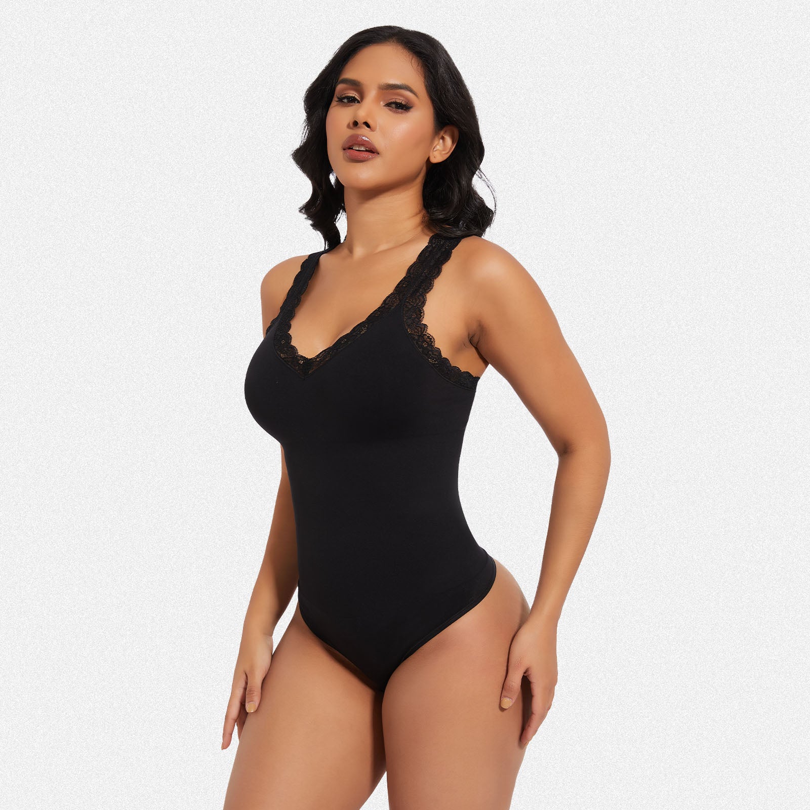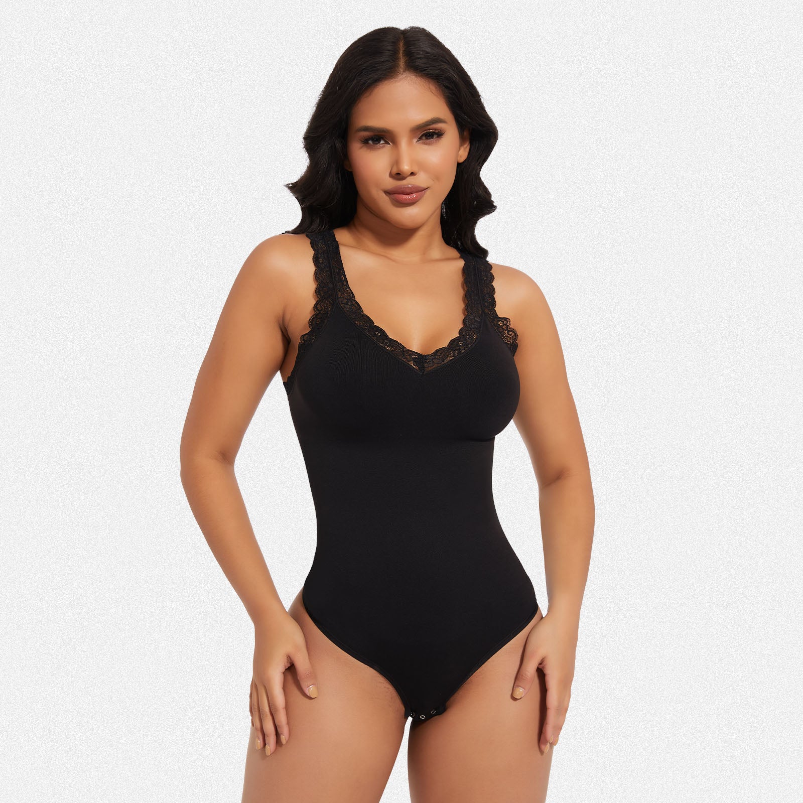 Discover the perfect blend of elegance and shaping with our lace V-neck bodysuit. Engineered for tummy control and body shaping, this stylish piece combines sensual lace detailing with powerful sculpting technology, ensuring a sleek and confident silhouette.