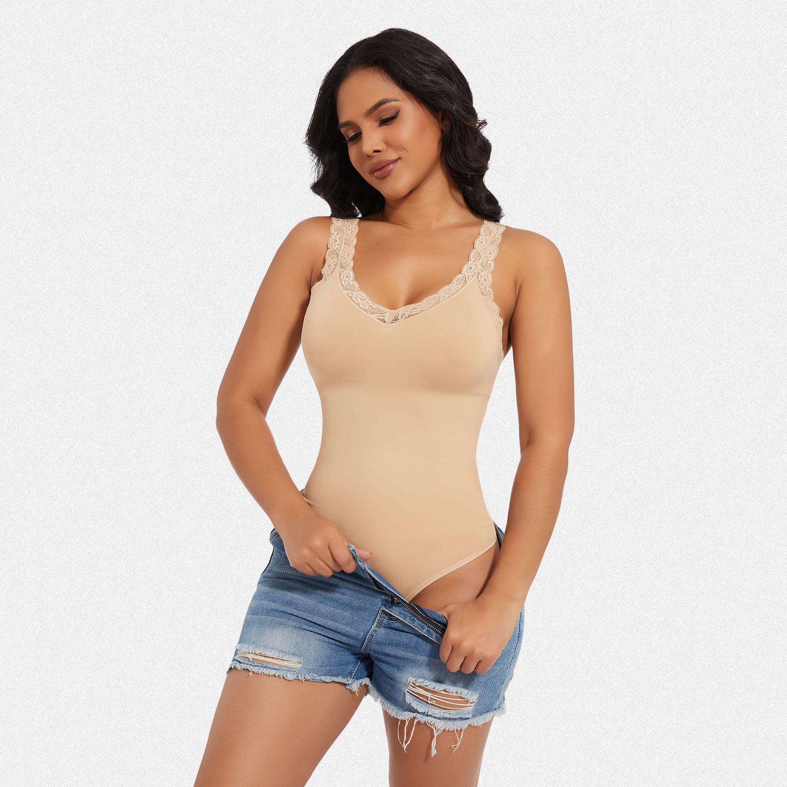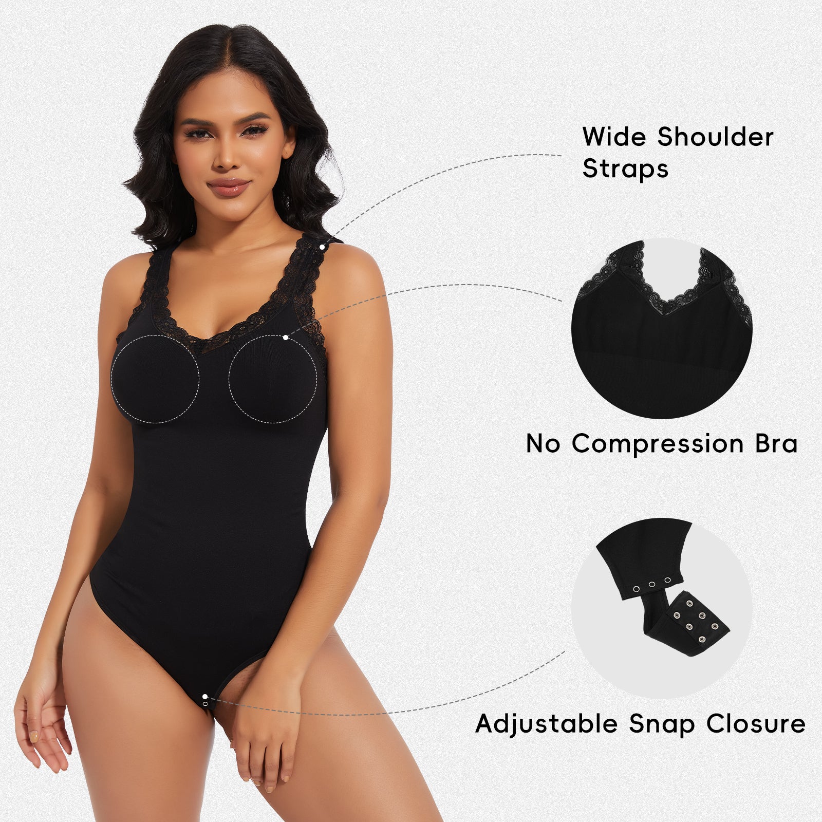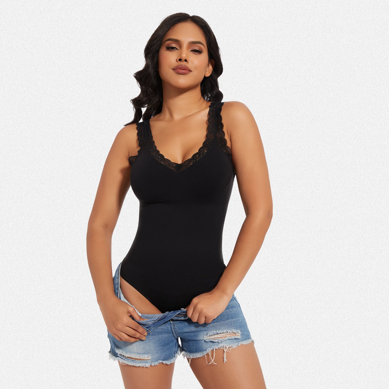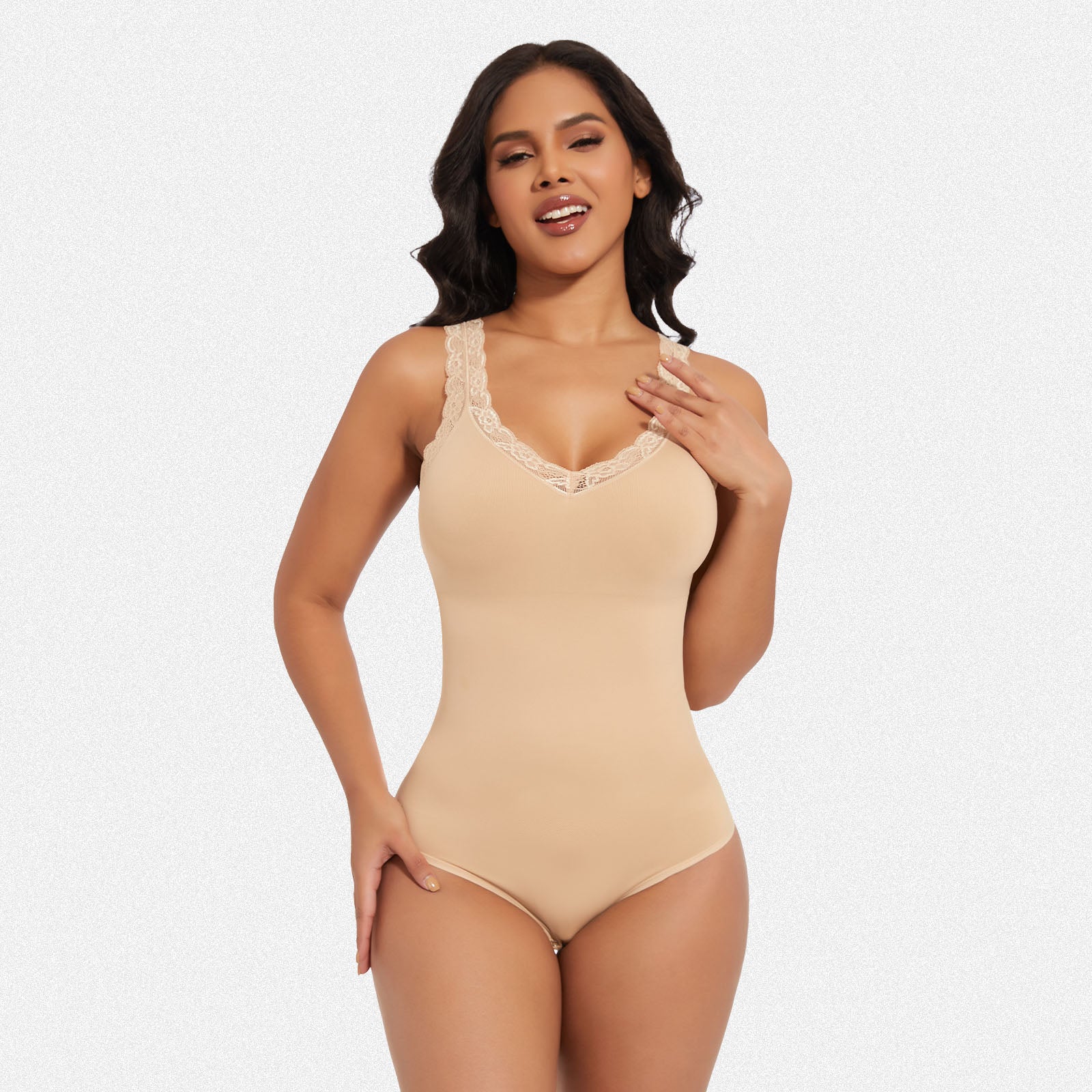 Discover the perfect blend of elegance and shaping with our lace V-neck bodysuit. Engineered for tummy control and body shaping, this stylish piece combines sensual lace detailing with powerful sculpting technology, ensuring a sleek and confident silhouette.
