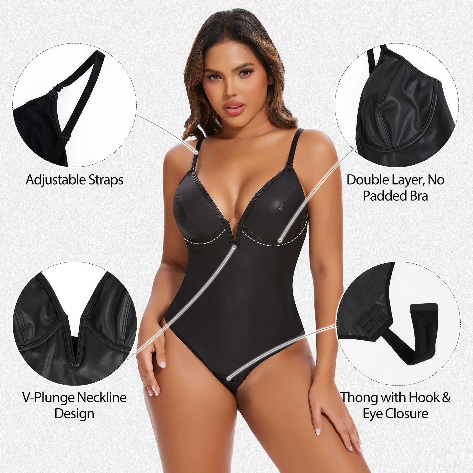 Shaperin Faux Leather Deep V Neck Shapewear Corset Bodysuit