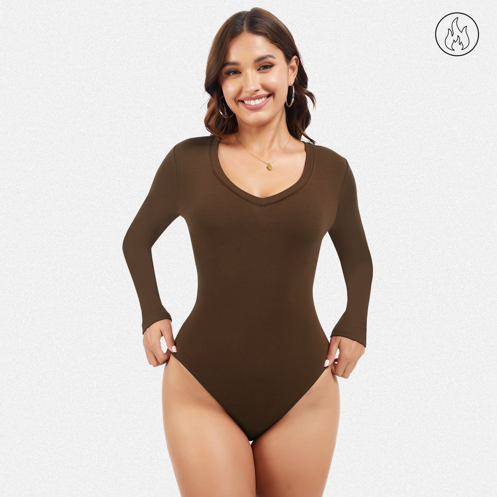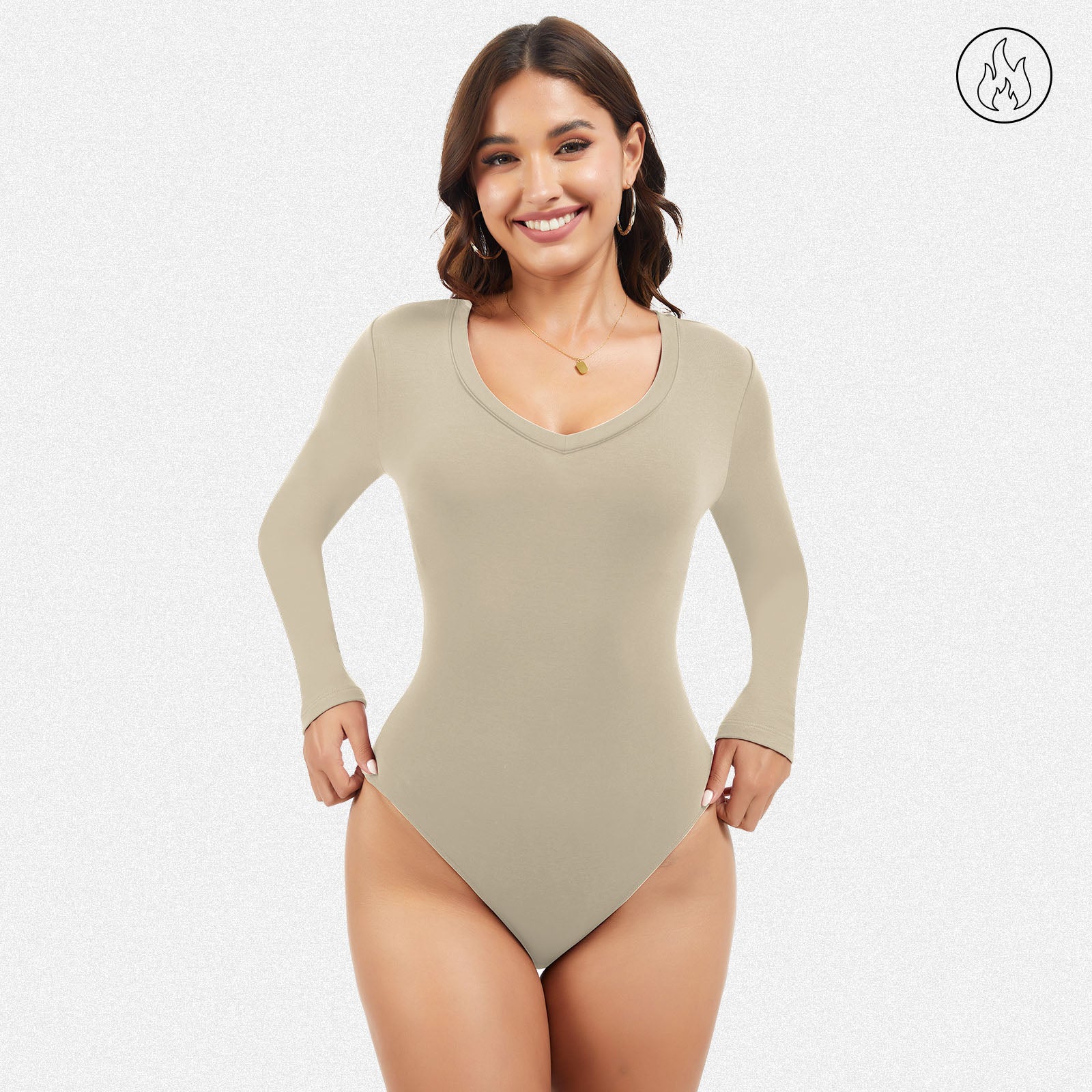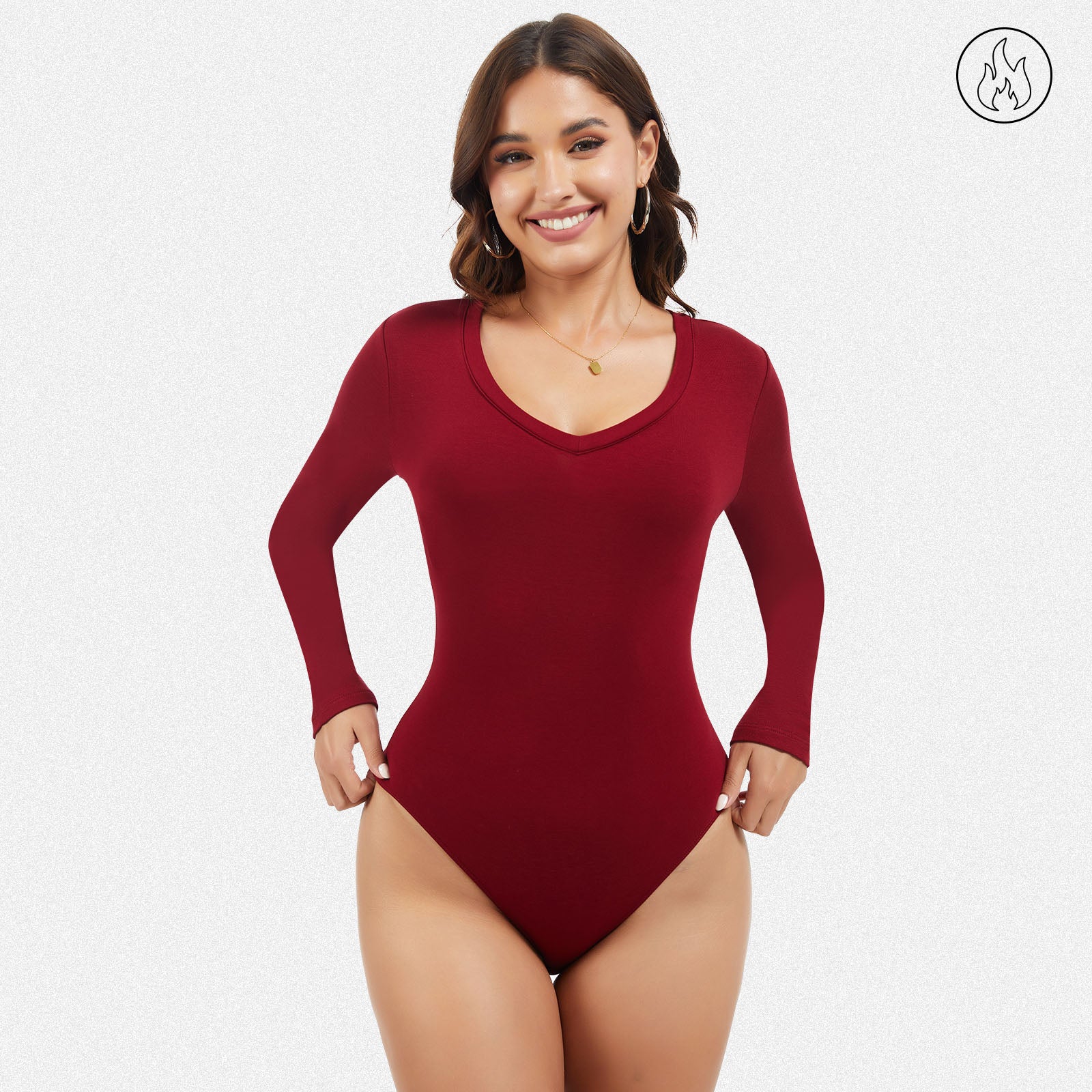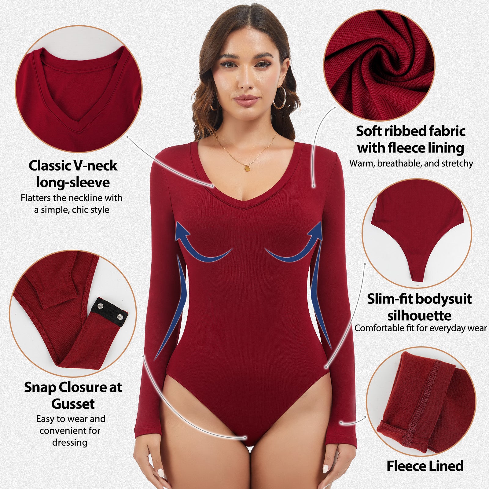 Shaperin Women’s V Neck Long Sleeve Ribbed Fleece Bodysuit Thermal Top