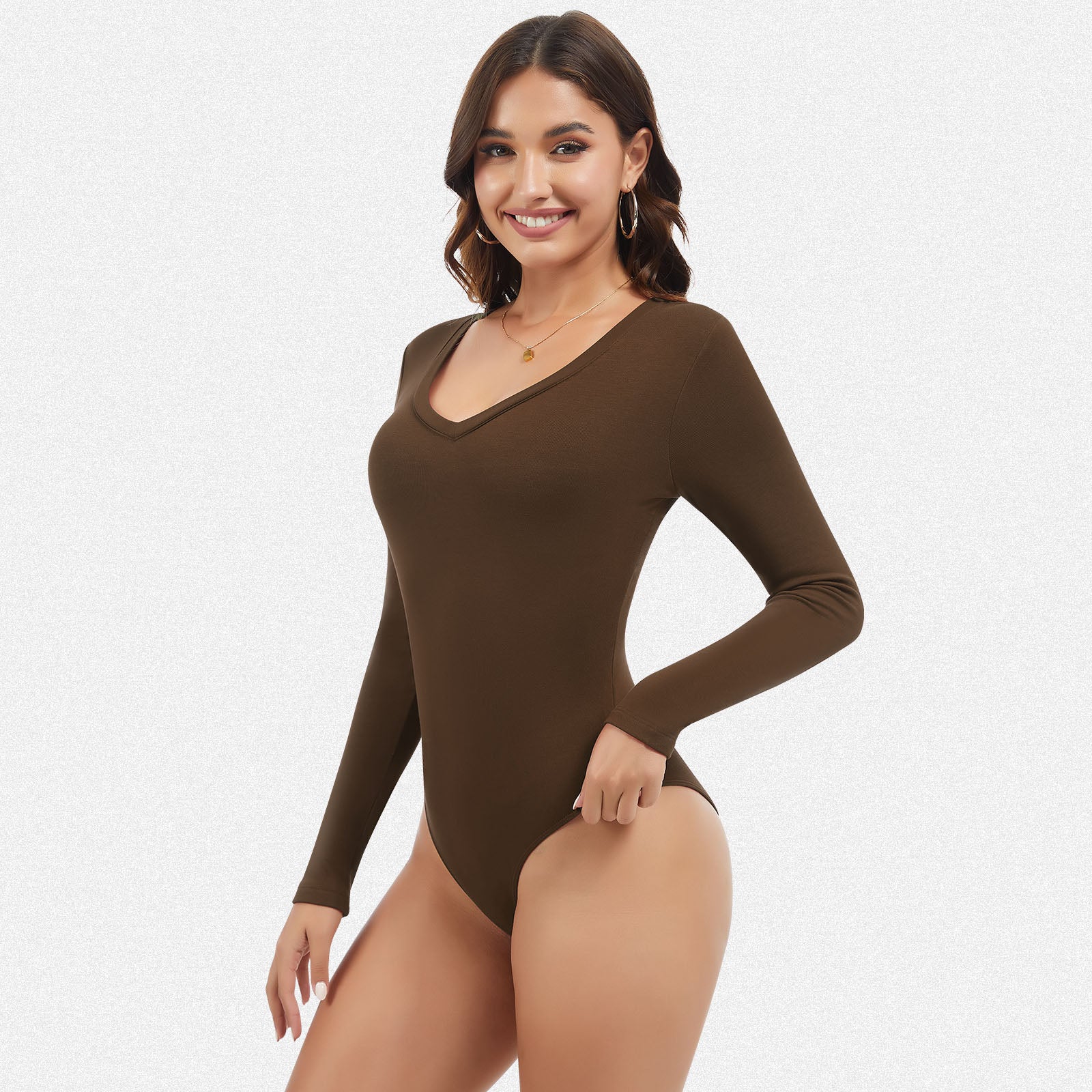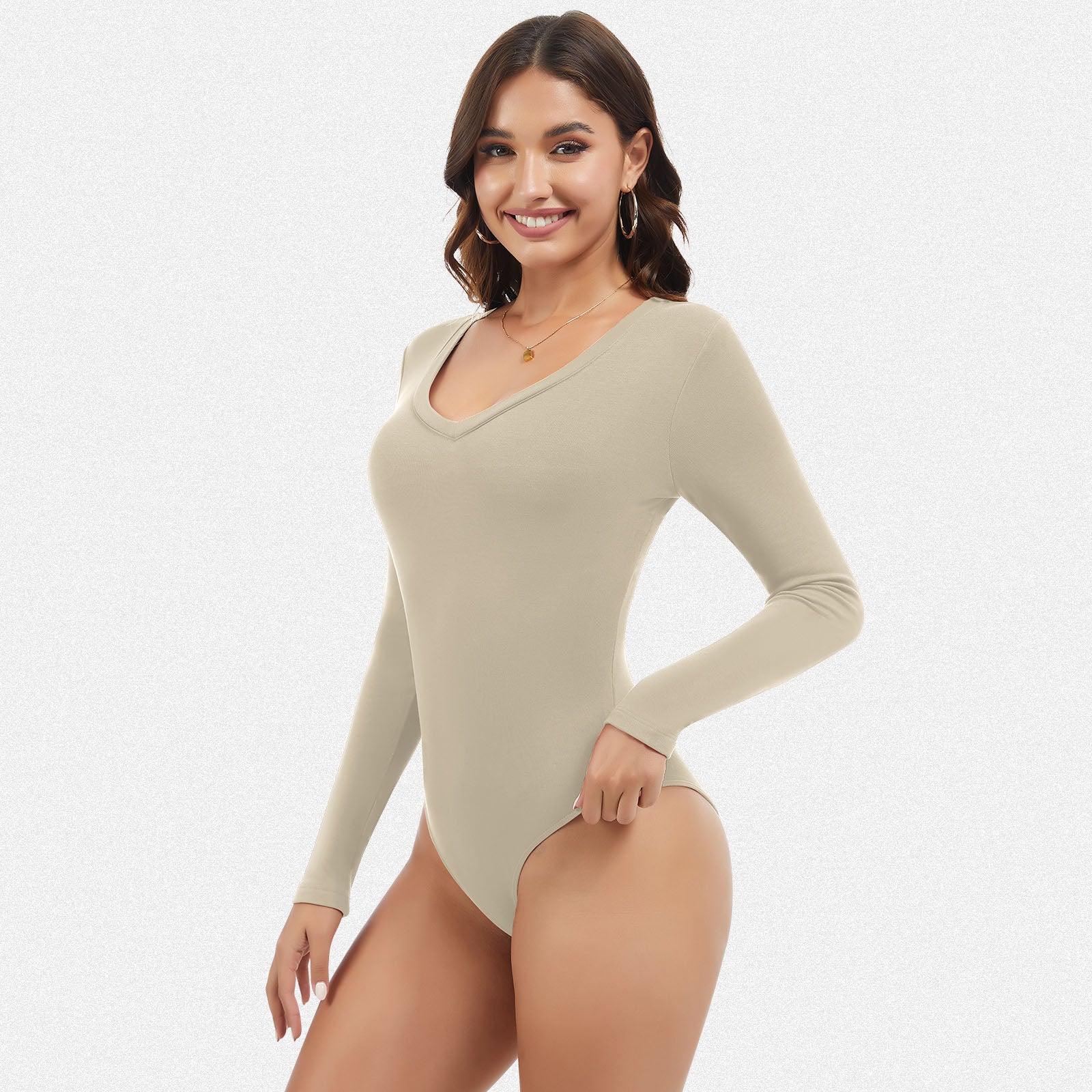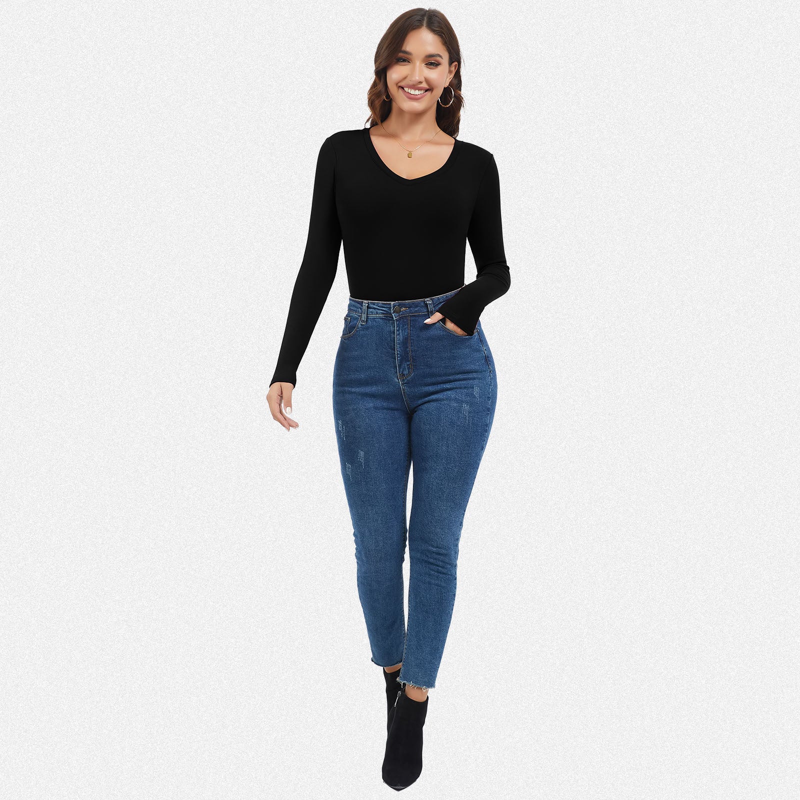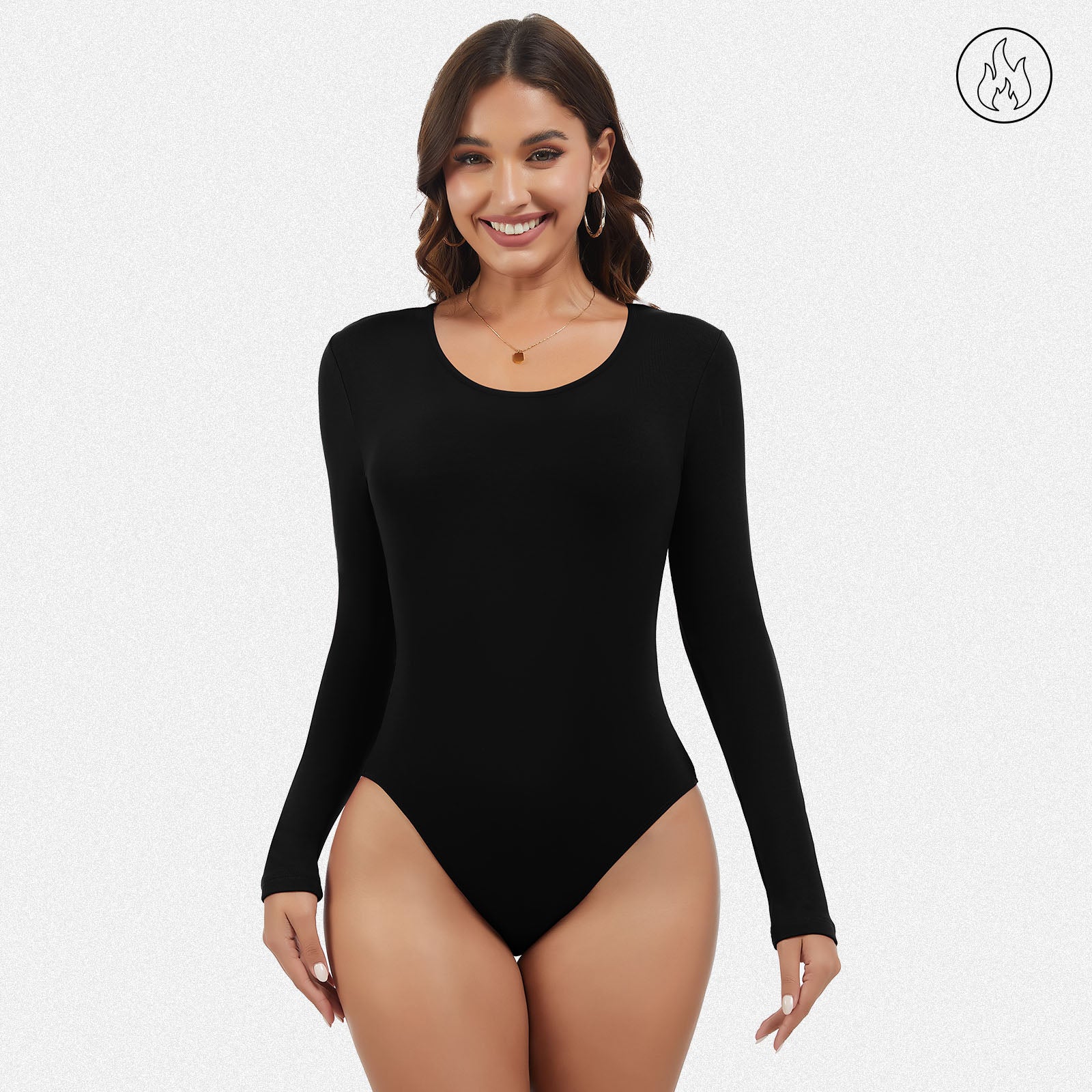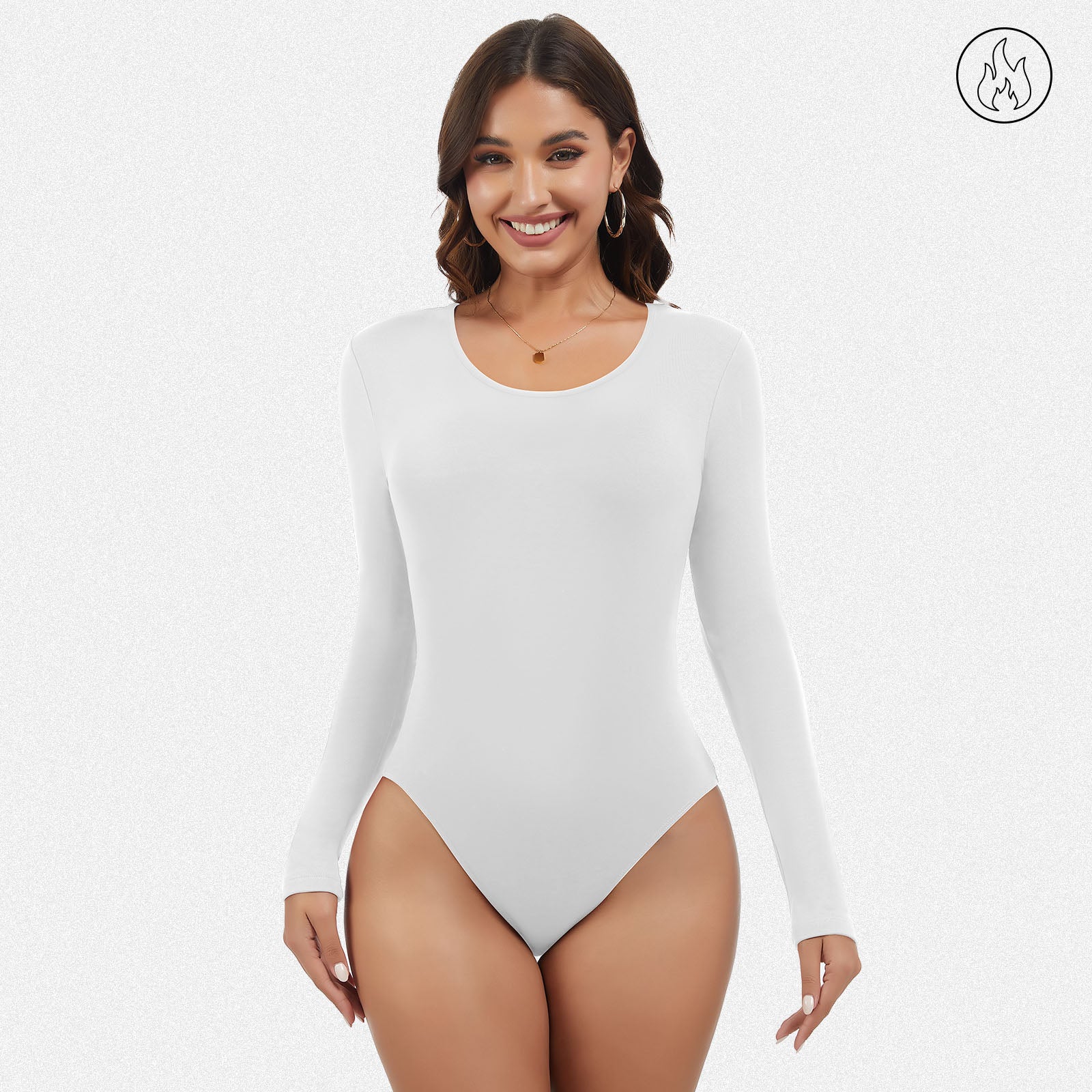 Shaperin Women’s V Neck Long Sleeve Ribbed Fleece Bodysuit Thermal Top