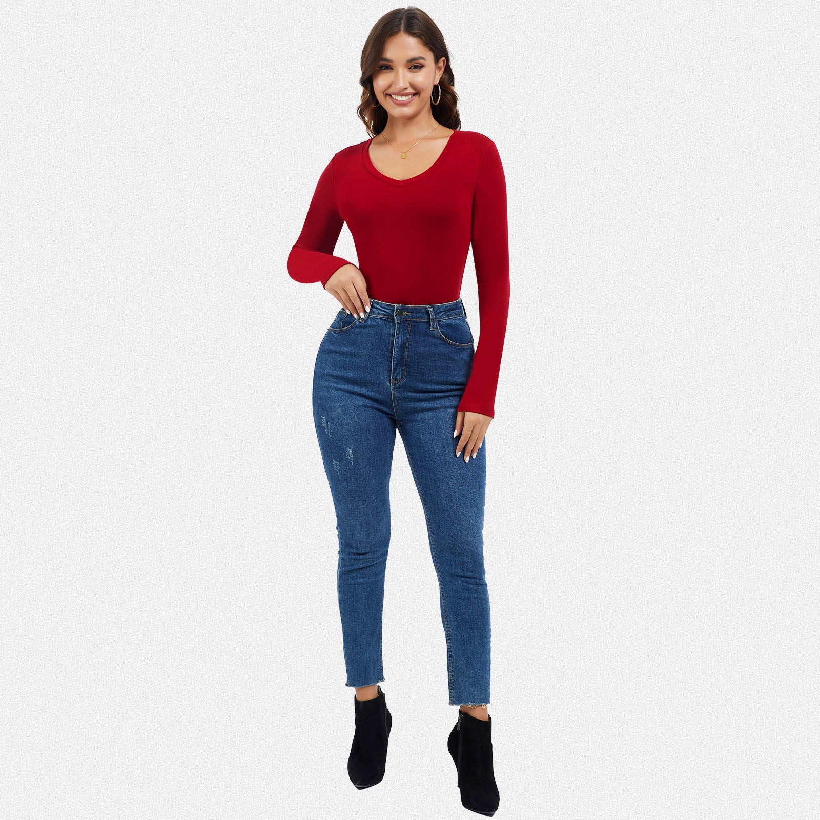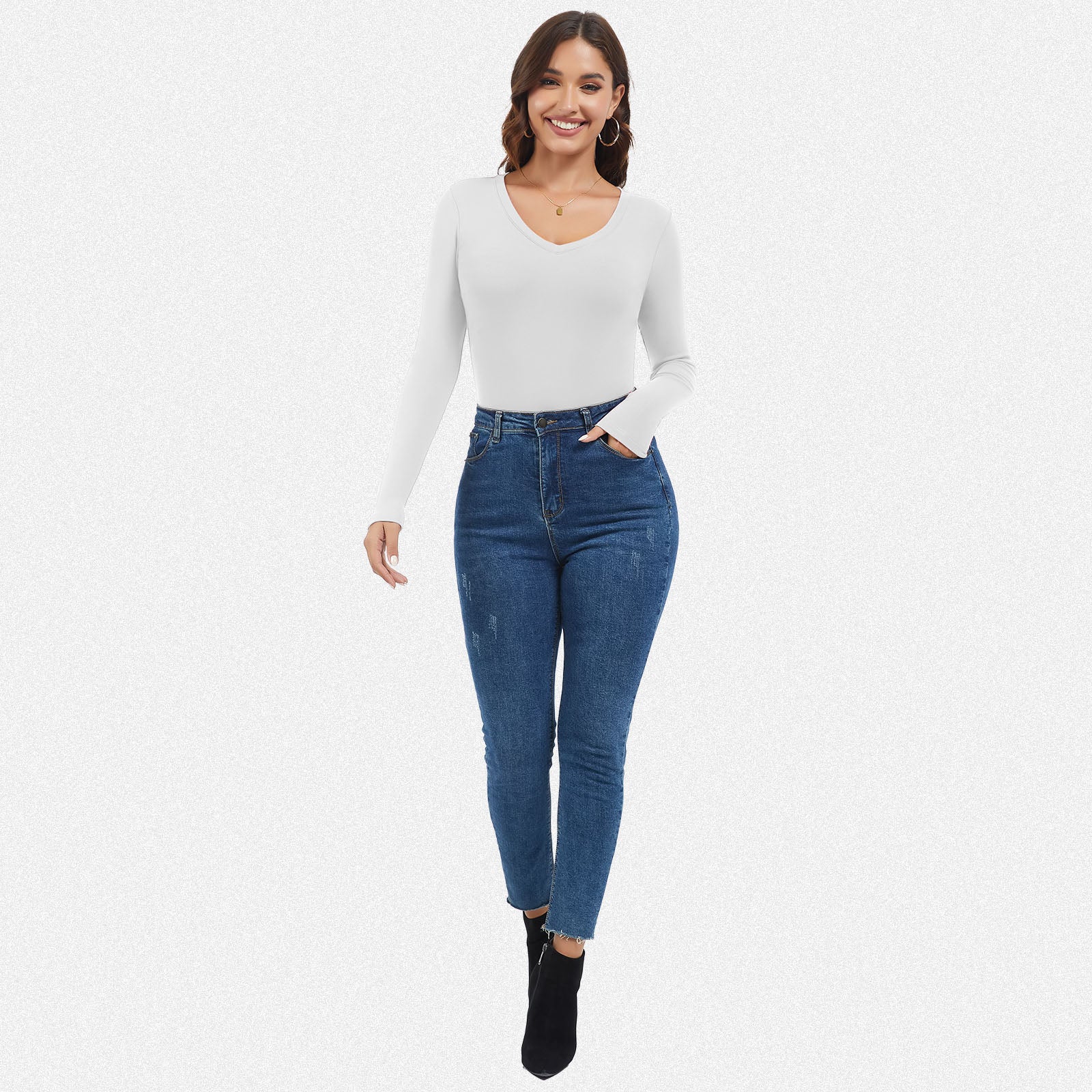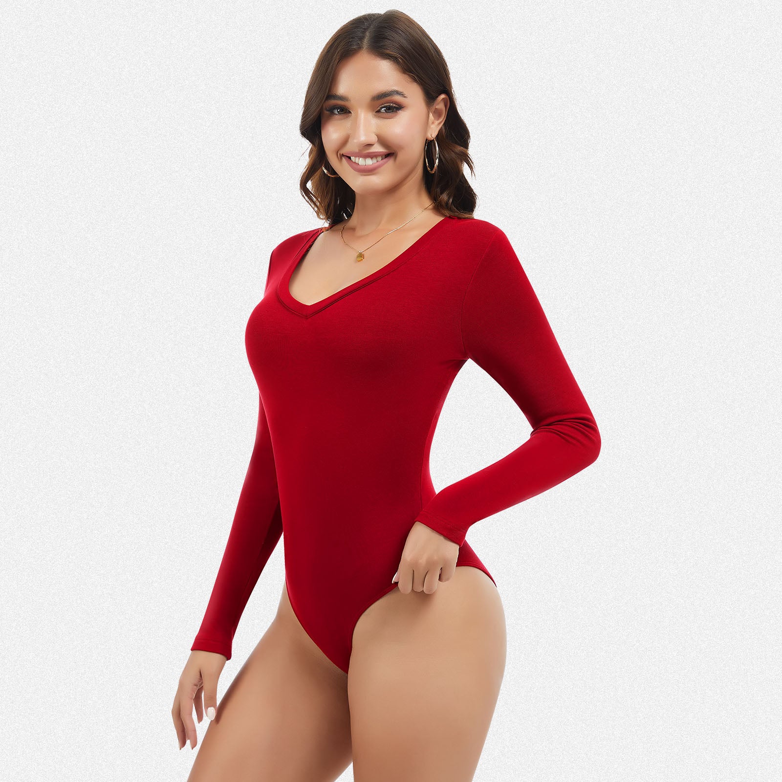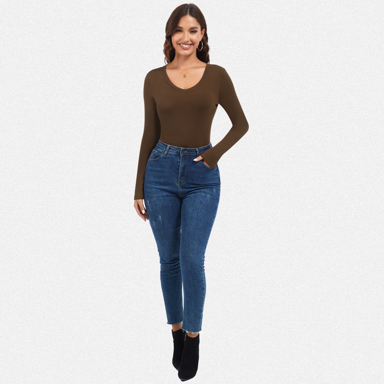 Shaperin Women’s V Neck Long Sleeve Ribbed Fleece Bodysuit Thermal Top
