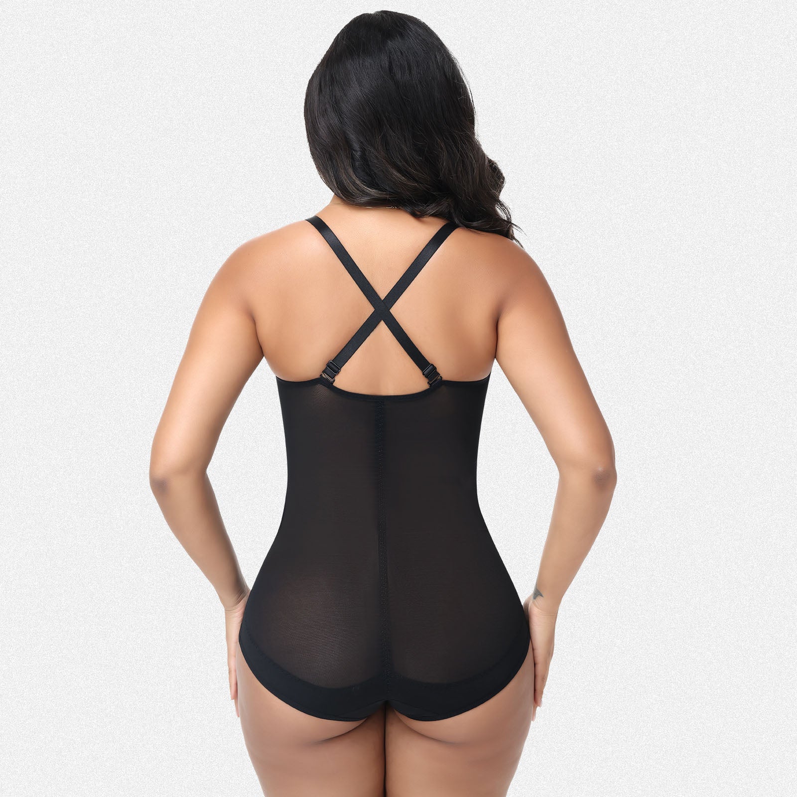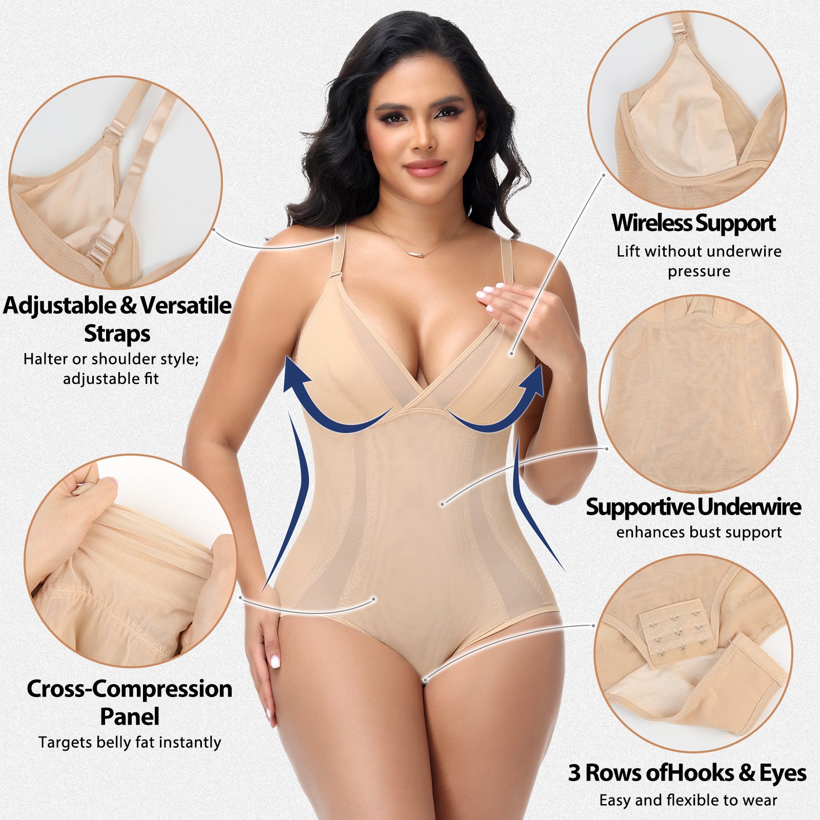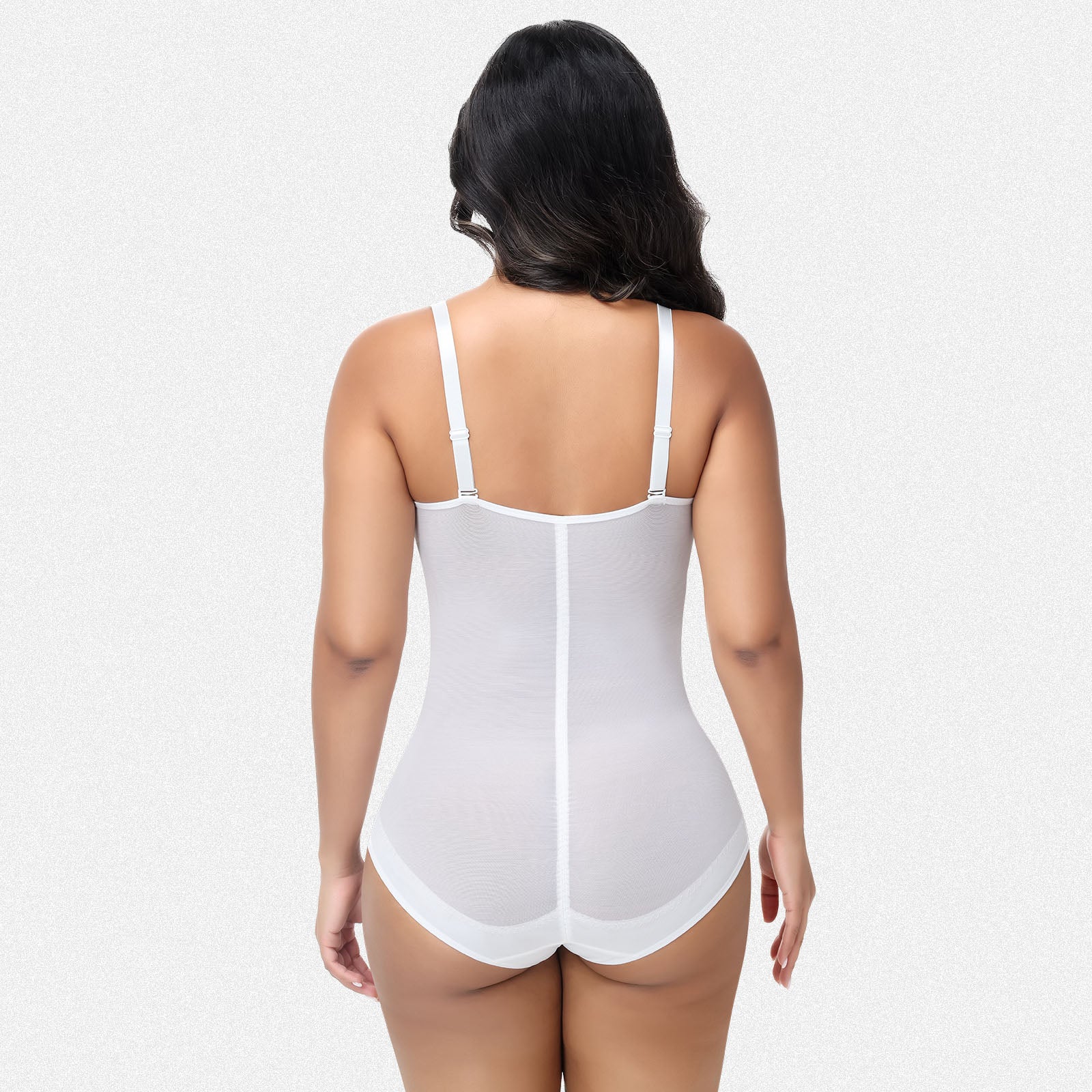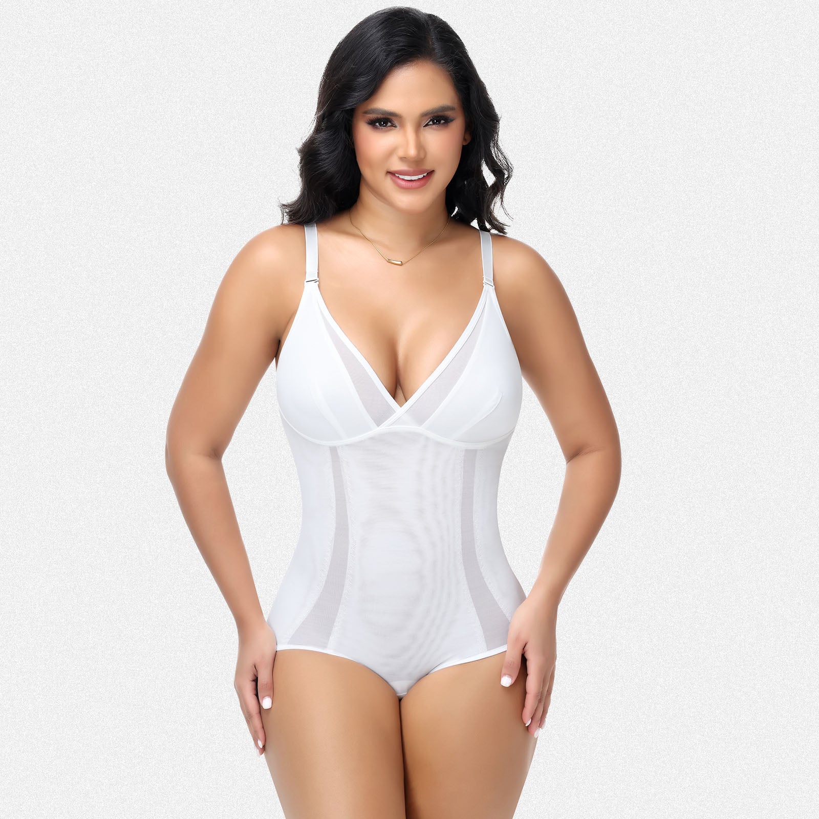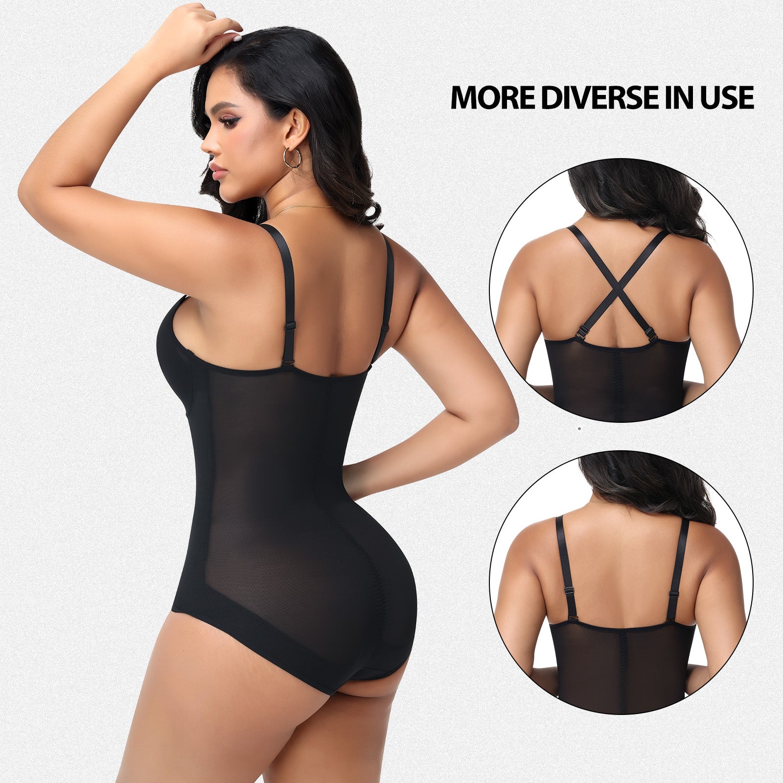 Featuring a flattering V-neck cami style and wireless soft bra support, this shaping bodysuit offers light lift and all-day comfort. The ruched brief enhances the hips, while adjustable and removable straps allow versatile styling. Finished with an adjustable hook-and-eye crotch closure and breathable cotton gusset, this tummy control bodysuit is perfect for daily wear, special occasions, or layering with your favorite outfits.