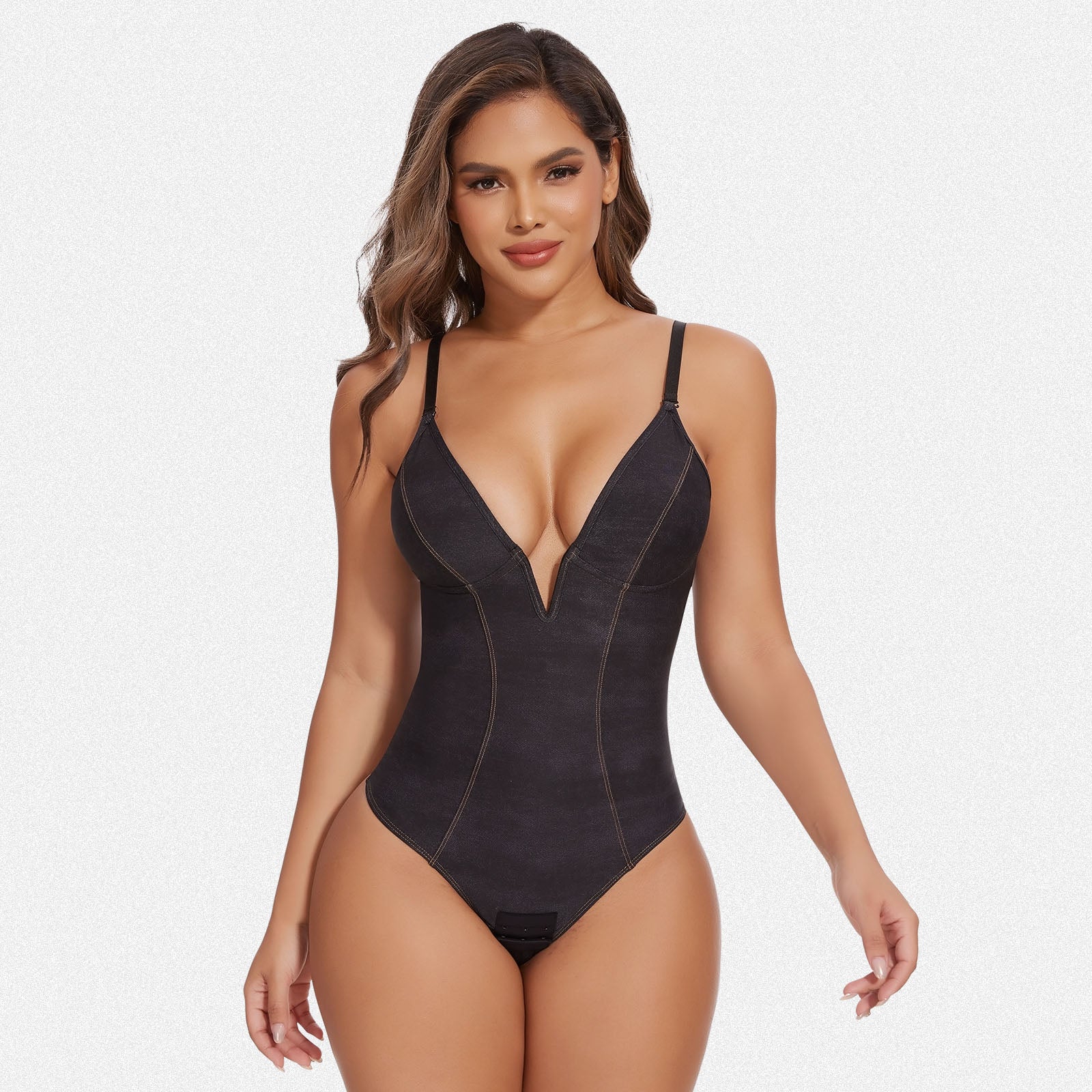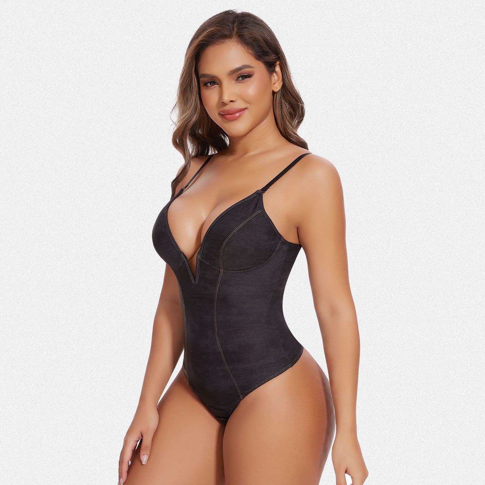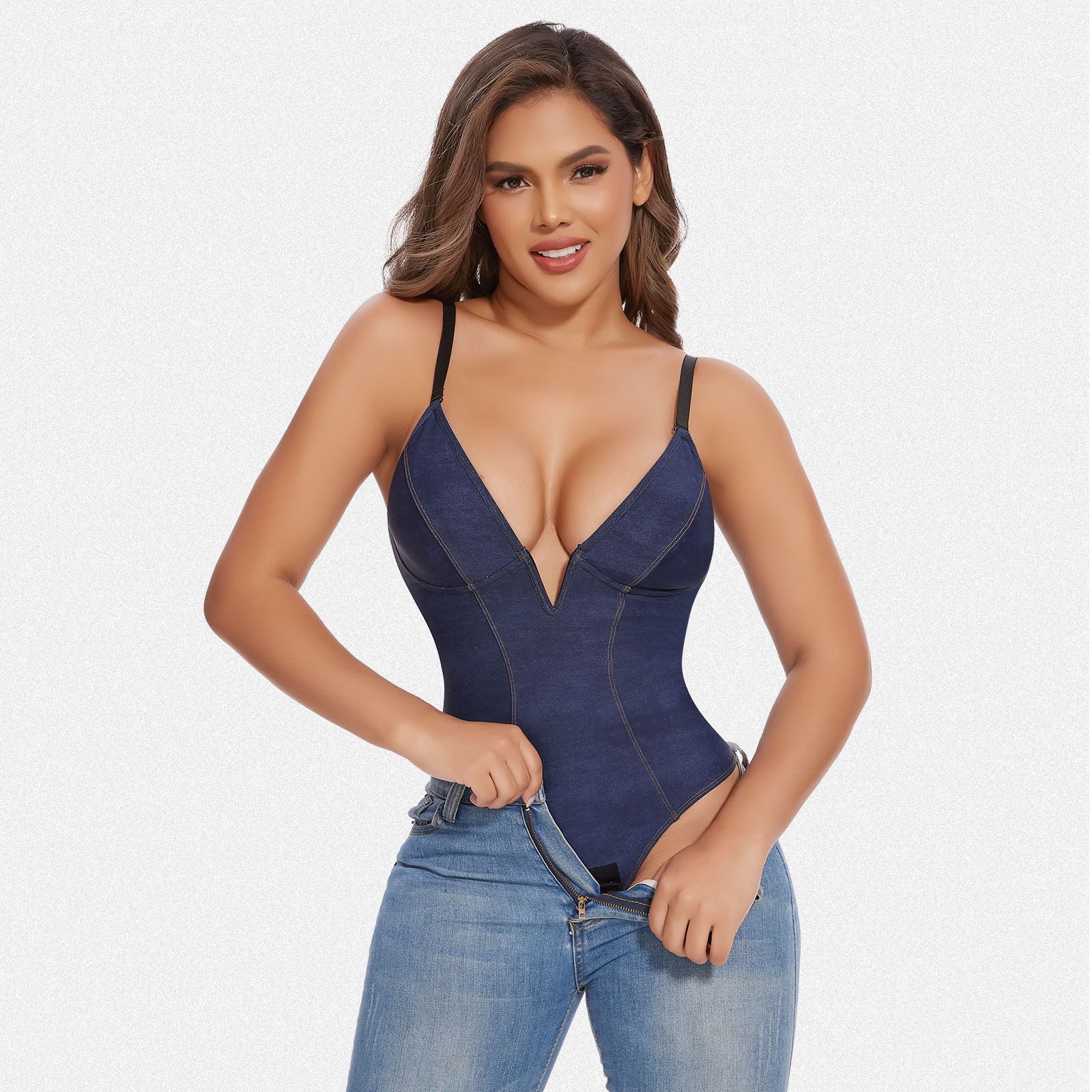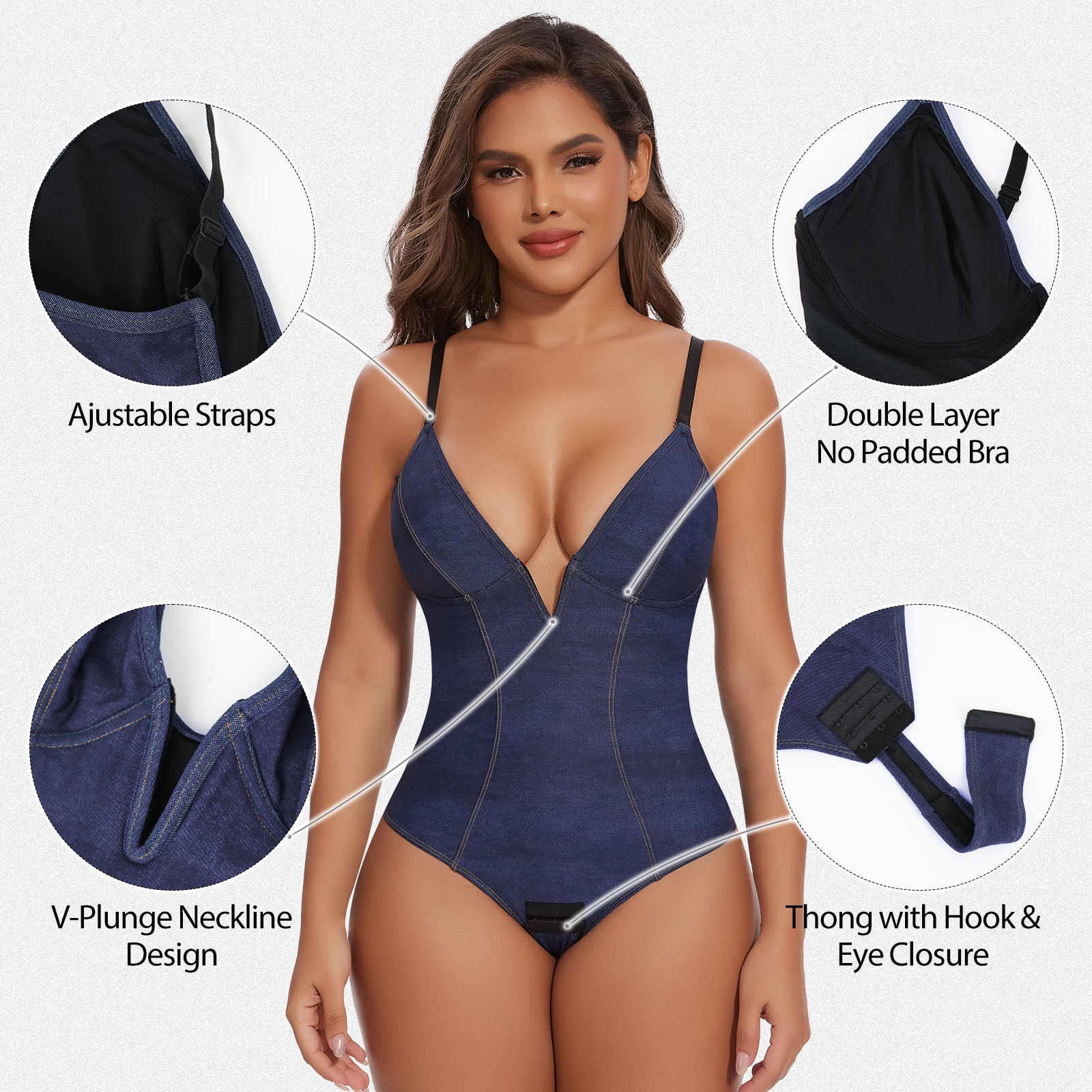 Experience the ultimate tummy control with Shaperin Faux Denim Plunging V-Neck Shapewear Bodysuit. Crafted for shaping and comfort, this seamless bodysuit offers effective tummy control, making it a perfect choice for a sleek and sculpted look. Breathable and high stretch body shaper combine denim outlook and soft touchness in one, quite comfy to wear all day.