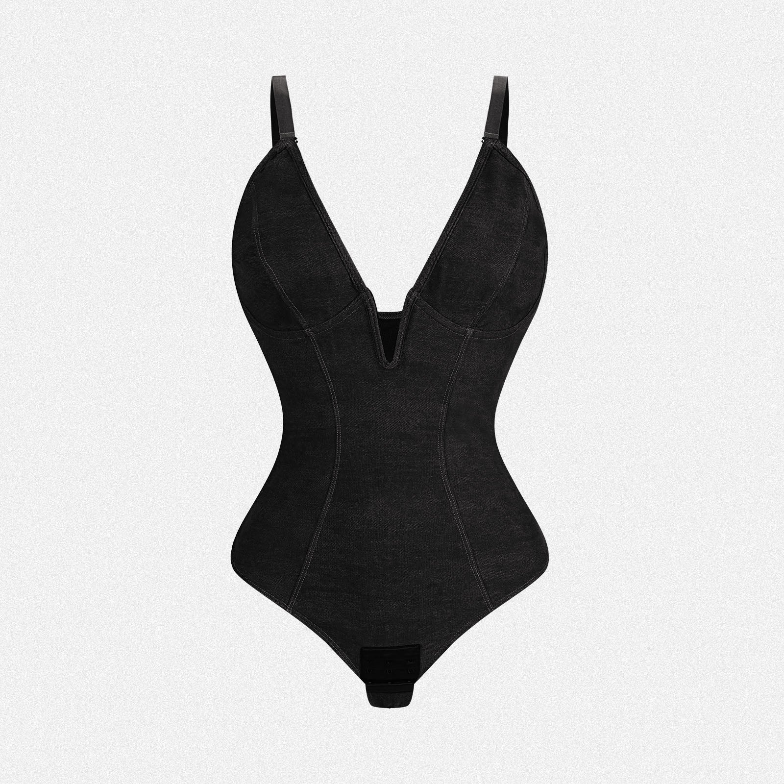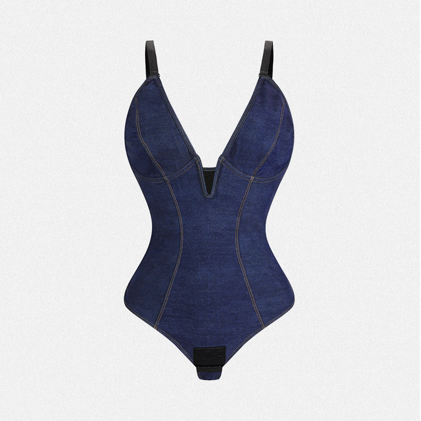 Shaperin Faux Denim Plunging V-Neck Shapewear Bodysuit