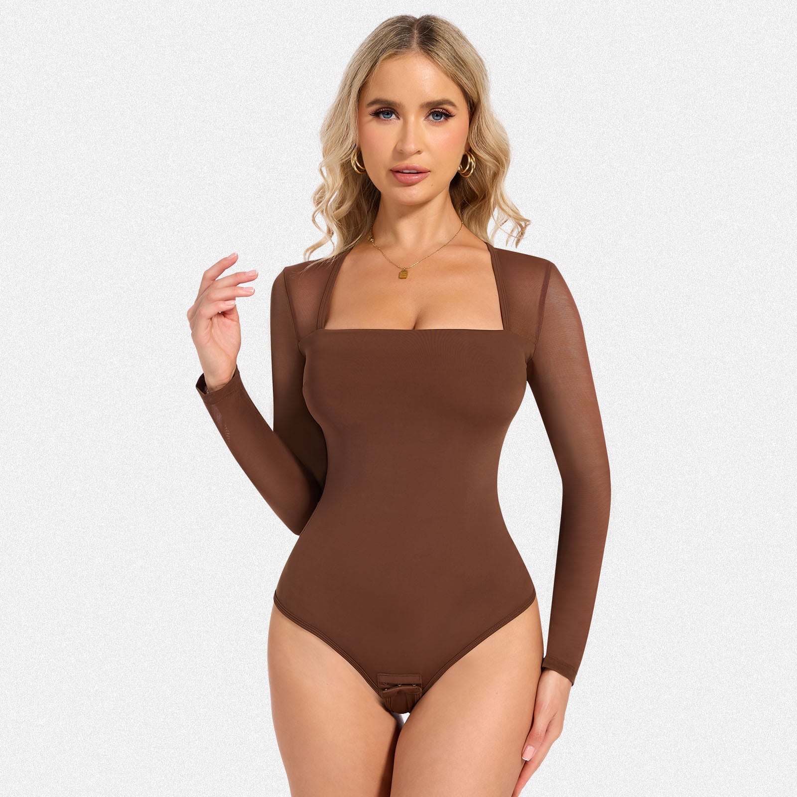 Elevate your everyday style with the Shaperin Bodysuit, designed for both comfort and sophistication. Crafted from soft four-way stretch fabric combined with high-elastic mesh, it delivers a breathable, flexible fit that flatters your shape while keeping you comfortable. The French trapezoid square neckline adds a chic and versatile touch, while the sheer sleeves and back bring a sexy, modern edge. Featuring tummy-smoothing mesh at the abdomen, an invisible thong design, and an adjustable snap closure, this bodysuit is perfect for layering or wearing alone to create effortless fashion looks for any occasion.